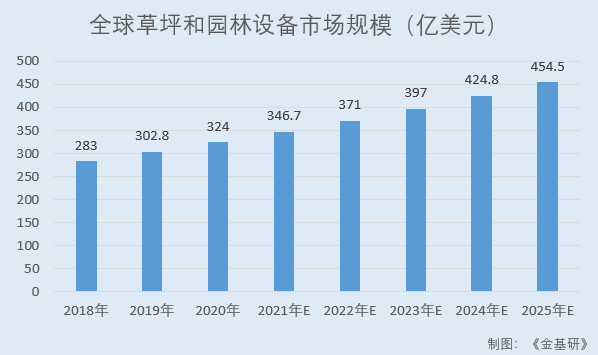 根據(jù)全球市場研究公司(Global Market Insights, Inc.)統(tǒng)計數(shù)據(jù),2018-2020年,全球草坪和園林設(shè)備市場規(guī)模分別為283億美元、302.8億美元、324億美元,預(yù)計至2025年將超過450億美元。