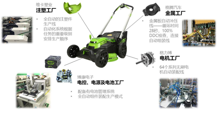作為全球新能源園林機械行業(yè)的領(lǐng) 先企業(yè)之一,格力博通過構(gòu)建垂直一體化的智能制造體系,實現(xiàn)降本增效,提升產(chǎn)品競爭力。同時,格力博還創(chuàng)新性地開發(fā)了多個電池包動力平臺,實現(xiàn)電池包在不同產(chǎn)品之間的互通互用,形成以鋰電池包為核心的產(chǎn)品生態(tài)系統(tǒng)。