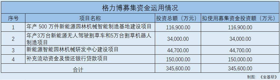 此番上市,格力博擬募集資金34.56億元投入四個募投項目,分別為“年產(chǎn)500萬件新能源園林機械智能制造基地建設(shè)項目”、“年產(chǎn)3萬臺新能源無人駕駛割草車和5萬臺割草機器人制造項目”、“新能源智能園林機械研發(fā)中心建設(shè)項目”、“補充流動資金及償還銀行貸款項目”。