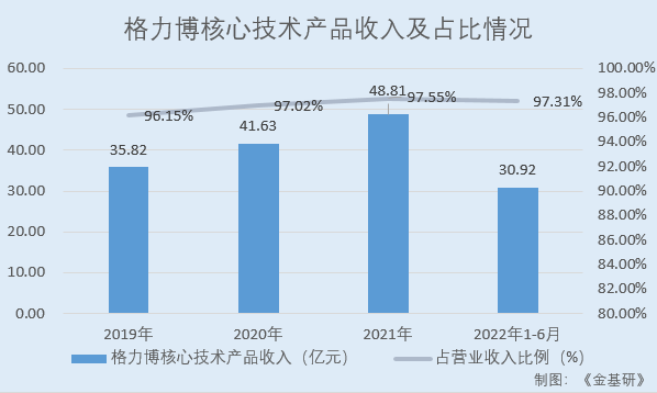 2019-2021年及2022年1-6月,格力博核心技術(shù)產(chǎn)品收入分別為35.82億元、41.63億元、48.81億元、30.92億元,占營業(yè)收入的比例分別為96.15%、97.02%、97.55%、97.31%。