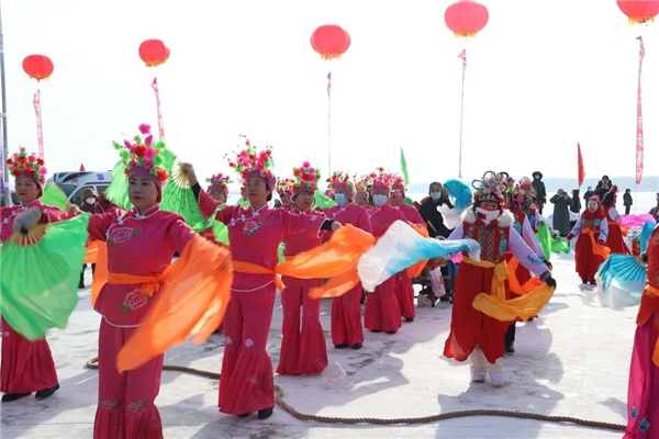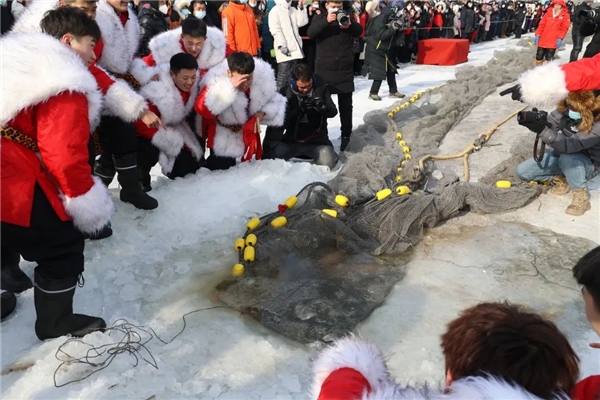 冬捕活動,世代傳承。雖然室外天氣寒冷,但依然擋不住游客們參與其中的熱情。鑿冰、下網、拉網、出魚,漁網中活蹦亂跳的魚兒浮出冰面,引得現場的游客爭相拍照打卡,呈現出了魚躍人歡的新春景象。作為癸卯兔年當地冬捕的第 一網“頭魚”,很多游客都想把寓意“連年有余”的“?!濒~帶回家,最終,活動現場的4條“頭魚”通過拍賣的方式,最 高以2.3萬元拍出。