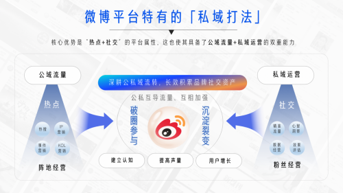 微博作為領(lǐng) 先的開放式社交媒體平臺(tái),海量公域流量與用戶關(guān)系交織融合,私域和公域緊密相連,這一優(yōu)勢(shì)決定了微博特有的“私域打法”。公私域聯(lián)動(dòng)能夠幫助品牌利用公域流量場(chǎng)快速提高聲量,沉淀私域社交資產(chǎn),從而影響用戶心智,實(shí)現(xiàn)更持續(xù)的價(jià)值釋放。