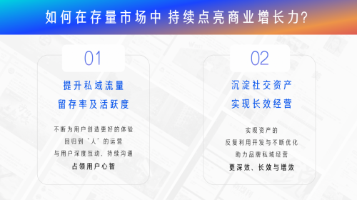簡(jiǎn)言之,由公私域引流所積累的社交資產(chǎn)就是品牌營(yíng)銷的核心競(jìng)爭(zhēng)力。那么如何在存量市場(chǎng)中高效沉淀社交資產(chǎn),持續(xù)點(diǎn)亮商業(yè)增長(zhǎng)力?有兩個(gè)問題亟需解決:一是提升私域流量留存率與活躍度,不斷為用戶創(chuàng)造更好的體驗(yàn),從而占領(lǐng)用戶心智;二是要完成社交資產(chǎn)的反復(fù)利用開發(fā)與不斷優(yōu)化,以此激發(fā)品牌私域經(jīng)營(yíng)能力,實(shí)現(xiàn)長(zhǎng)效經(jīng)營(yíng)。
