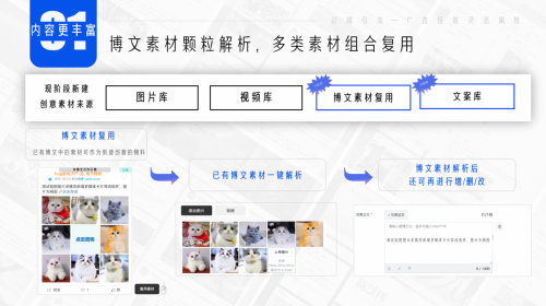 具體到產(chǎn)品上,微博超粉將支持已有博文素材“一鍵解析”,解析后可以進(jìn)行增、刪、改,多類素材組合復(fù)用,提高創(chuàng)意組合的靈活性。