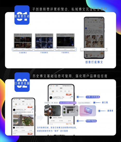 “可累積”是指在一個(gè)創(chuàng)意下,不同子創(chuàng)意產(chǎn)生的所有“轉(zhuǎn)贊評(píng)”會(huì)累積在創(chuàng)意打底博文?!翱蓮?fù)用”是指新建創(chuàng)意時(shí),可直接將歷史已有博文的“轉(zhuǎn)贊評(píng)”等信息作為“組件”進(jìn)行復(fù)用,從而避免廣告博文所展現(xiàn)的互動(dòng)數(shù)據(jù)差的情況,增加用戶的品牌信任度。