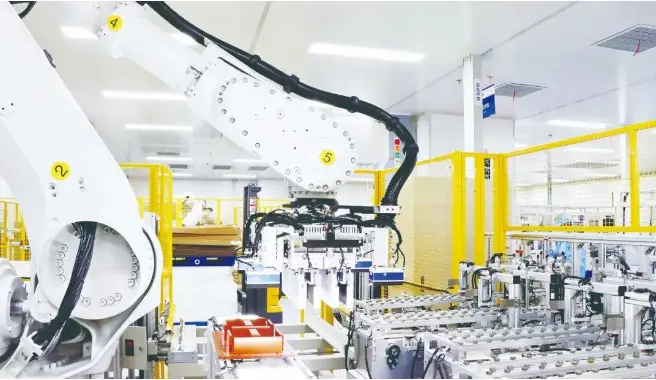 走進(jìn)海辰儲能鋰電智能制造一期M1智慧工廠,全自動的生產(chǎn)線正有條不紊運(yùn)行。經(jīng)過攪拌、涂布、模切、入殼、注液、包膜等16道程序,一顆顆儲能電池有序下線。