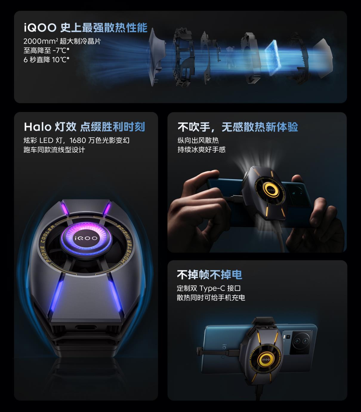 除了專注散熱功能外,iQOO散熱背夾在支持邊散熱邊充電方面也做的非常出色,雙Type C接口搭配L型短充線,在有效控制機(jī)身發(fā)熱的同時(shí),讓充電更安全更高效。據(jù)官方可靠信息,iQOO 散熱背夾2 Pro主打高溫保護(hù),當(dāng)機(jī)身的溫度逐漸升高時(shí),機(jī)身會(huì)自動(dòng)斷電進(jìn)而立刻恢復(fù)制冷。此外,其采用的獨(dú)特的防冷凝水的干濕分隔式架構(gòu),保護(hù)好主板和電路,使其避免觸水短路,多項(xiàng)保護(hù),無懼冷凝水。