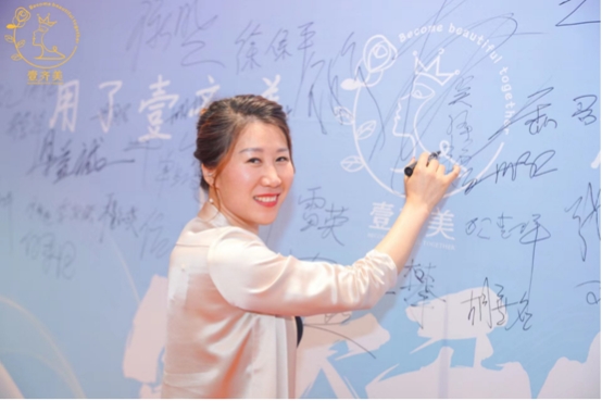 壹齊美總裁譽軒女士與珠海著名主持人劉團 在壹齊美坦洲旗艦店開業(yè)晚宴簽到墻簽名留念。