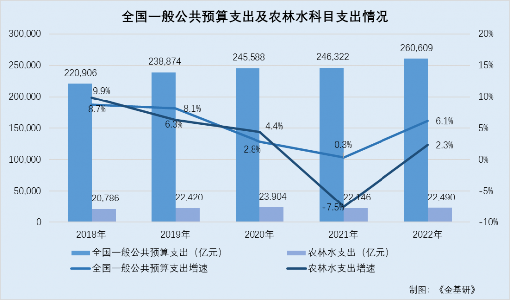 其中,農(nóng)林水科目支出分別為20,786億元、22,420億元、23,904億元、22,146億元、22,490億元,同比增速分別為9.9%、6.3%、4.4%、-7.5%、2.3%。