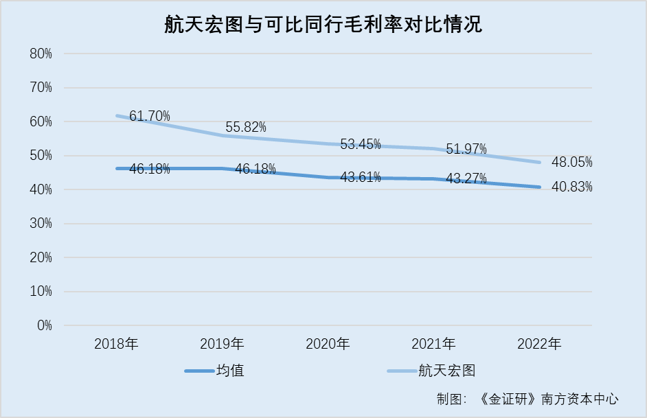2018-2022年,航天宏圖的毛利率分別為61.7%、55.82%、53.45%、51.97%、48.05%。