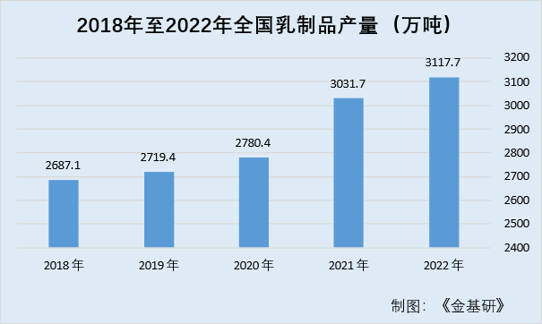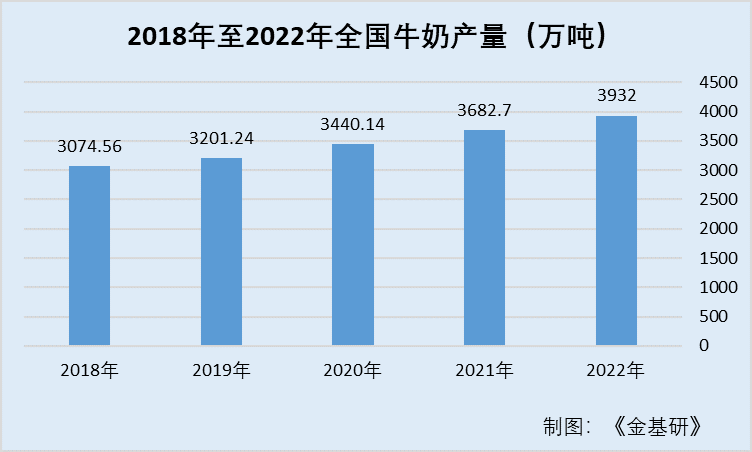 隨著近年來下游需求的持續(xù)增長以及國內(nèi)奶牛養(yǎng)殖規(guī)模化進(jìn)程的持續(xù)推進(jìn),國內(nèi)牛奶產(chǎn)量也隨之逐年增長。據(jù)國家統(tǒng)計(jì)局?jǐn)?shù)據(jù),2018年,全國牛奶產(chǎn)量已超3,000萬噸產(chǎn)量。2018年至2022年間,全國牛奶產(chǎn)量分別為3074.56萬噸、3201.24萬噸、3440.14萬噸、3682.7萬噸、3932萬噸,年產(chǎn)量增長率分別為4.1%、7.5%、7.1%、6.8%。可以看出,國內(nèi)牛奶生產(chǎn)增速平穩(wěn),牛奶產(chǎn)量逐年穩(wěn)步提升,這為乳制品產(chǎn)量穩(wěn)定增長奠定了基礎(chǔ),同時(shí)也是乳制品價(jià)格的穩(wěn)定的保障。