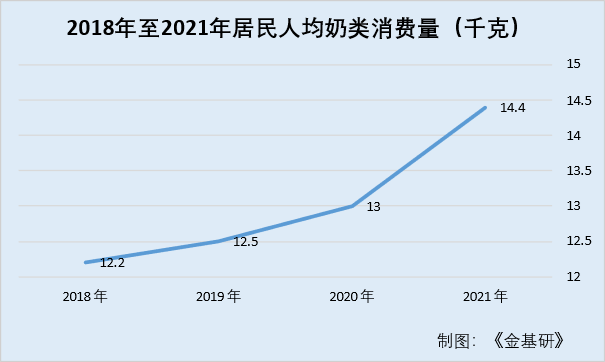 從消費(fèi)量情況來看,隨著人們對健康飲食的重視及全球乳制品產(chǎn)業(yè)的快速發(fā)展,促進(jìn)了人們牛奶需求量的增長,對牛奶消費(fèi)量也隨之不斷增加。據(jù)國家統(tǒng)計(jì)局?jǐn)?shù)據(jù),2018年至2021年居民人均奶類消費(fèi)量分別為12.2千克、12.5千克、13千克、14.4千克,從圖形上看,居民人均奶類消費(fèi)量呈加速增長趨勢。