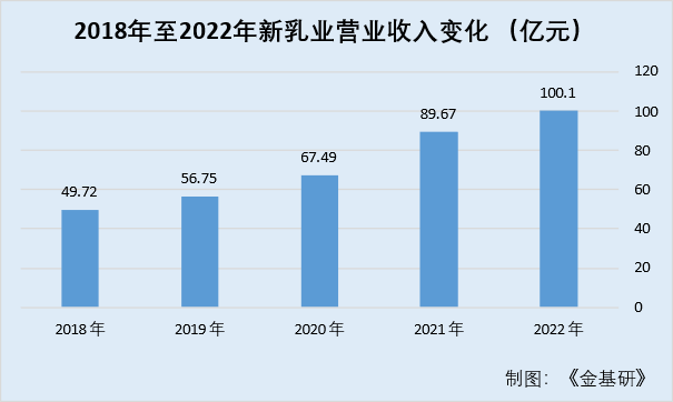 據(jù)東方財(cái)富數(shù)據(jù),從營業(yè)收入的總額上看,2018至2022年,新乳業(yè)的營業(yè)收入逐年上升,這5年內(nèi)其營業(yè)收入分別為49.72億元、56.75億元、67.49億元、89.67億元、100.1億元。