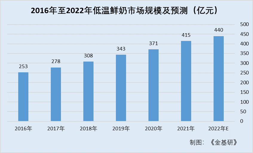 據(jù)中商產(chǎn)業(yè)研究院數(shù)據(jù),2017年,低溫鮮奶市場規(guī)模達(dá)到278億元,同比增長達(dá)9.9%。2018年,低溫鮮奶市場規(guī)模再創(chuàng)新高,達(dá)到308億元,同比增長超過10%。2019年,低溫鮮奶市場規(guī)模達(dá)到343億元,同比增長11.4%。2020年,低溫鮮奶市場的增長速度受到一定影響,但依然保持了增長態(tài)勢,全年市場規(guī)模達(dá)到371億元,同比增長超過8%。2021年,低溫鮮奶市場規(guī)模再次突飛猛進(jìn),同比增長達(dá)12%。國內(nèi)低溫鮮奶市場規(guī)模不斷提高,由2016年的253億元增長至2021年的415億元,復(fù)合年均增長率為10.4%。預(yù)計(jì)2022年低溫鮮奶市場規(guī)模將達(dá)440億元。