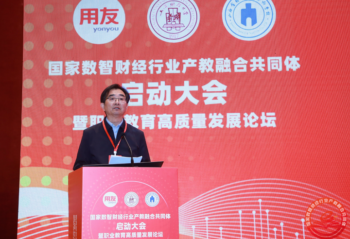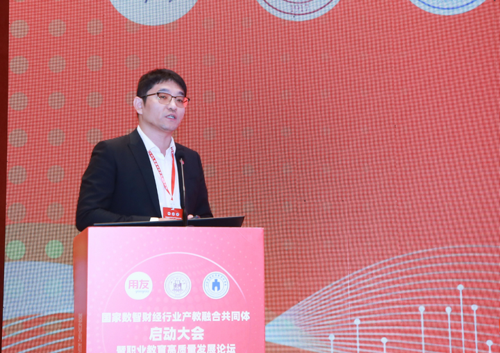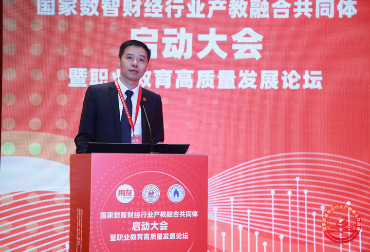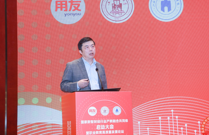 用友新道科技股份有限公司董事長兼總裁陳強兵在致辭中表示,一直以來,產(chǎn)教融合、校企合作是扎根中國大地辦教育的根本途徑,在過去很長一段時間內(nèi)產(chǎn)教融合、校企合作存在各種問題,相信通過共同體的新模式,一定能夠解決這些老問題。他指出,用友網(wǎng)絡作為國家數(shù)智財經(jīng)行業(yè)產(chǎn)教融合共同體的牽頭企業(yè),將會堅定貫徹“共建、共創(chuàng)、 共享”的基本原則,將共同體打造成為全體成員共生共長的發(fā)展平臺,也堅信國家數(shù)智財經(jīng)行業(yè)產(chǎn)教融合共同體是進一步深化產(chǎn)教融合的新模式、新方法,是一種嶄新的協(xié)同發(fā)展模式,最終將會實現(xiàn)產(chǎn)教融合、科教融匯。陳強兵表示,希望國家數(shù)智財經(jīng)行業(yè)產(chǎn)教融合共同體的成立,能夠為國家財經(jīng)行業(yè)的創(chuàng)新發(fā)展注入新的活力,為整個財經(jīng)行業(yè)與產(chǎn)業(yè)的轉(zhuǎn)型升級提供強有力的支撐。