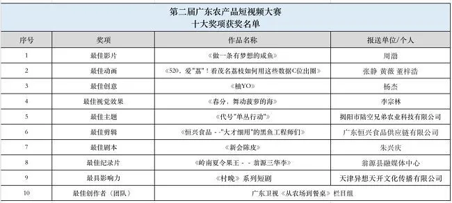 今年是廣東“百縣千鎮(zhèn)萬村高質(zhì)量發(fā)展工程”的開局之年。在這個(gè)廣東省“頭號(hào)工程”的引領(lǐng)下,第二屆廣東農(nóng)產(chǎn)品短視頻大賽于8月18日正式啟動(dòng)。歷經(jīng)一個(gè)多月,共征集了近2萬條短視頻,賽事總曝光量高達(dá)5億。最終,大賽主辦方根據(jù)公眾熱度統(tǒng)計(jì)、專家評(píng)選等,評(píng)選出十大獎(jiǎng)項(xiàng)獲獎(jiǎng)作品。