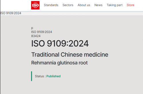 2024 年 1 月,《中醫(yī)藥—地黃》國(guó)際標(biāo)準(zhǔn)(ISO 9109: 2024 Traditional Chinese medicine—Rehmannia glutinosa root)由國(guó)際標(biāo)準(zhǔn)化組織(ISO)正式發(fā)布,這是由上海中醫(yī)藥大學(xué)、河南中醫(yī)藥大學(xué)及仲景宛西制藥聯(lián)合完成的《中醫(yī)藥—地黃》國(guó)際標(biāo)準(zhǔn),也是地黃第 一個(gè)國(guó)際標(biāo)準(zhǔn),具有非常重大的意義。