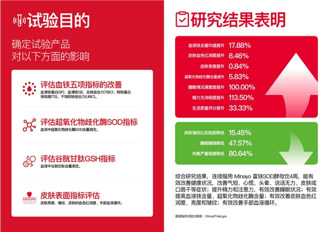 美國(guó)臨床試驗(yàn)注冊(cè)庫(kù)[1]出具的《美那有富鐵SOD酵母飲對(duì)女性缺鐵性貧血和皮膚及氣血改善的臨床研究》報(bào)告是緋紅瓶的信賴(lài)底氣,報(bào)告結(jié)果顯示,連續(xù)服用Minayo美那有緋紅瓶4周,血液鐵含量均值提升17.88%,能有效改善健康狀況,改善氣短、心慌、頭暈、說(shuō)話無(wú)力、皮膚或口唇干等癥狀;睡眠障礙降低47.47%,提升精力和注意力,有效改善睡眠狀況;提高超氧化物歧化酶含量;皮膚皺紋比實(shí)驗(yàn)前降低15.45%,改善皮膚血色紅潤(rùn)度、亮度和皺紋;有效改善手部血液循環(huán)。,真正做到氣血兩補(bǔ),為萬(wàn)千女性健康保駕護(hù)航。