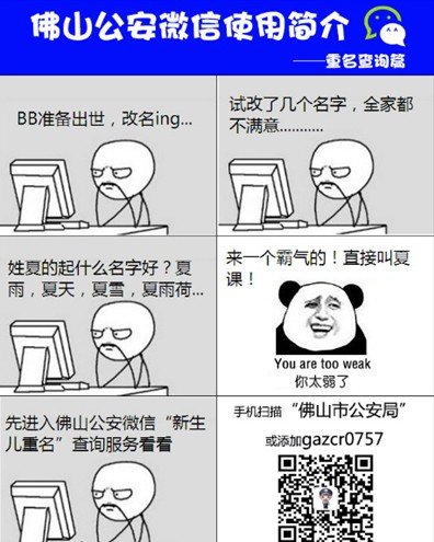 在為將要出生的BB改名而煩惱?想知道自己或者親友的姓名是不是很普遍?“佛山市公安局”微信可以幫到您!通過重名查詢服務(wù),就可以輕松達(dá)成您的愿望。