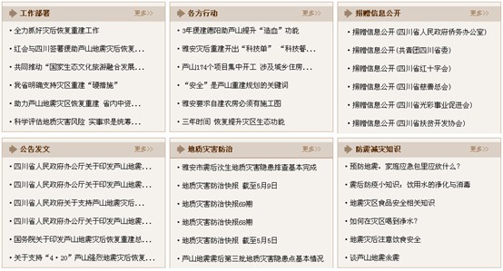 欄目規(guī)劃全面。專題全面公開災(zāi)情信息、決策部署、救援搶險、次生災(zāi)害、路況信息、物資供給等信息。整合網(wǎng)站辦事服務(wù)欄目的民政部門捐贈救助、公安部門證件辦理等相關(guān)辦事服務(wù)事項21項。與雅安市共建“雅安市人民政府一線報道”子專題,聚合鏈接23個省直部門網(wǎng)站抗震救災(zāi)專題。轉(zhuǎn)載或同步直播9場地震新聞發(fā)布會。貫徹落實(shí)魏宏省長的指示要求,在專題及在省政府網(wǎng)站首頁顯著位置開設(shè)“‘4?20’蘆山強(qiáng)烈地震捐贈信息公開”專欄,展示各相關(guān)單位及主管社團(tuán)組織的捐贈款物接收和使用信息。
