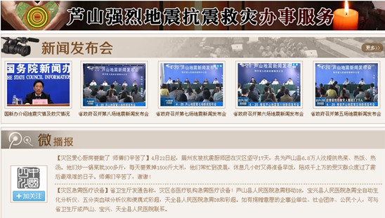 四川省人民政府網(wǎng)站在“4·20”蘆山地震中,第一時間制作專題,專題內(nèi)容實(shí)現(xiàn)7*24小時不間斷更新。及時公開政府第一手信息,內(nèi)容全面、透明、信息量大;欄目合理實(shí)用;內(nèi)容互動性強(qiáng)。使政府信息在短時間內(nèi)形成抗災(zāi)救災(zāi)的合力,充分發(fā)揮了信息公開第一平臺、權(quán)威平臺的作用。