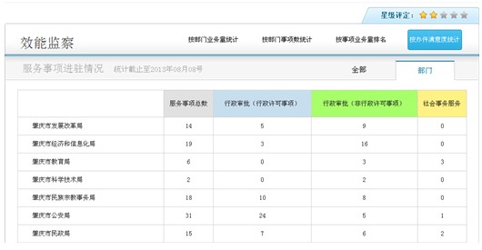 ?。?)事項辦理全程監(jiān)控:申請人可以對事項進行網(wǎng)上咨詢、進度查詢和結果查詢,并對服務進行星級評定。監(jiān)察部門全程跟蹤,對逾期辦理的部門進行警告和處理。