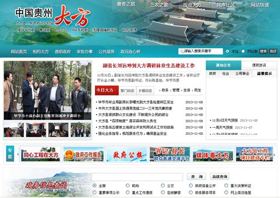 貴州省大方縣政府門戶網(wǎng)站群,以縣政府門戶網(wǎng)站“中國(guó)貴州—大方政務(wù)門戶網(wǎng)”為主站。出臺(tái)了《關(guān)于進(jìn)一步加強(qiáng)縣政府門戶網(wǎng)站群建設(shè)工作的通知》文件,就如何加強(qiáng)政府門戶網(wǎng)站群管理作出具體的可操作性的規(guī)定。網(wǎng)站群集34個(gè)鄉(xiāng)鎮(zhèn)子網(wǎng)站和40個(gè)部門子網(wǎng)站為一休,統(tǒng)一對(duì)外發(fā)布政府信息,成為大方縣電子政務(wù)應(yīng)用的重要組成部分以及政府信息公開(kāi)的主要載體和平臺(tái)。政府網(wǎng)站群的建設(shè)標(biāo)志著大方縣電子政務(wù)建設(shè)的重心發(fā)生轉(zhuǎn)移,由局部建設(shè)轉(zhuǎn)向整合建設(shè),由分散、自發(fā)建設(shè)轉(zhuǎn)向集約化統(tǒng)籌建設(shè),為政府網(wǎng)站實(shí)現(xiàn)深層次、跨部門的信息整合和資源開(kāi)發(fā)利用打下基礎(chǔ)。
