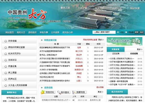 貴州省大方縣政府門戶網(wǎng)站群,以縣政府門戶網(wǎng)站“中國(guó)貴州—大方政務(wù)門戶網(wǎng)”為主站。出臺(tái)了《關(guān)于進(jìn)一步加強(qiáng)縣政府門戶網(wǎng)站群建設(shè)工作的通知》文件,就如何加強(qiáng)政府門戶網(wǎng)站群管理作出具體的可操作性的規(guī)定,網(wǎng)站群集34個(gè)鄉(xiāng)鎮(zhèn)子網(wǎng)站和40個(gè)部門子網(wǎng)站為一休。2011年印發(fā)了《大方縣網(wǎng)絡(luò)媒體反映事項(xiàng)問(wèn)責(zé)辦理暫行規(guī)定》、《大方縣政府網(wǎng)站群建設(shè)管理辦法》,建立工作機(jī)制,組建管理團(tuán)隊(duì),全縣各鄉(xiāng)鎮(zhèn)、各部門明確由辦公室主任擔(dān)任網(wǎng)絡(luò)發(fā)言人,并采用實(shí)名制注冊(cè)登錄(注明網(wǎng)絡(luò)發(fā)言人字樣),形成覆蓋全縣、三級(jí)聯(lián)動(dòng)的工作機(jī)制。建立網(wǎng)絡(luò)發(fā)言人管理制度、網(wǎng)絡(luò)媒體反映事項(xiàng)問(wèn)責(zé)辦理暫行辦法等網(wǎng)絡(luò)問(wèn)政效能問(wèn)責(zé)配套制度,將網(wǎng)絡(luò)問(wèn)政工作的各環(huán)節(jié)、各步驟進(jìn)行規(guī)范,固化辦理流程,明確辦理時(shí)限,落實(shí)工作責(zé)任制度,確保網(wǎng)絡(luò)問(wèn)政工作有序開(kāi)展。