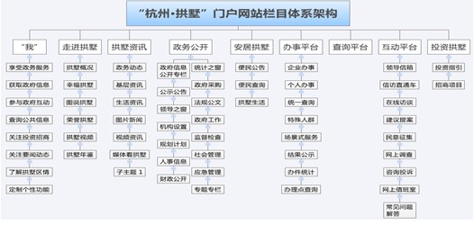 ?。?)進(jìn)一步優(yōu)化網(wǎng)站欄目架構(gòu)體系。2013年,“杭州?拱墅”門(mén)戶網(wǎng)站對(duì)網(wǎng)站欄目架構(gòu)體系進(jìn)行優(yōu)化,按照以“用戶為中心,服務(wù)為導(dǎo)向”的服務(wù)型政府網(wǎng)站建設(shè)宗旨,通過(guò)科學(xué)規(guī)劃、信息資源整合、共享,突出拱墅區(qū)資源特色,在網(wǎng)站欄目組織架構(gòu)、瀏覽便捷、頁(yè)面布局、搜索設(shè)置、內(nèi)容完整等方面進(jìn)行完善。通過(guò)優(yōu)化欄目架構(gòu)和服務(wù)體系,不斷提升網(wǎng)站的綜合水平,創(chuàng)新服務(wù)內(nèi)容和服務(wù)形式,提高“杭州?拱墅”門(mén)戶網(wǎng)站的服務(wù)深度。網(wǎng)站欄目?jī)?yōu)化包括1個(gè)索引式導(dǎo)航和8個(gè)一級(jí)欄目、51個(gè)二級(jí)欄目,具體欄目體系的結(jié)構(gòu)如下圖所示: