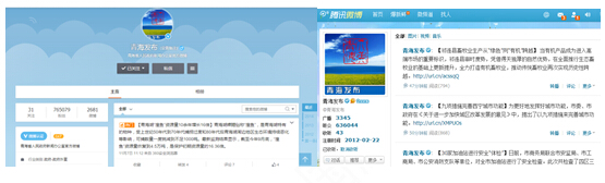(2)"青海發(fā)布"微博。為滿足不同用戶獲取政府信息的需求,省政府門戶網(wǎng)站與受關注度較高,粉絲量較大的青海發(fā)布新浪微博和騰訊微博進行有效鏈接,使政府網(wǎng)站與微博平臺進行有效銜接,拓寬用戶信息獲取渠道。青海發(fā)布微博開通以來已發(fā)布三千多條微博信息,并積極開展微博問政等相關活動,當前粉絲數(shù)已達到140多萬。積極回應網(wǎng)民關切,為網(wǎng)民了解青海經濟、政治、社會、文化和生態(tài)文明建設等開通便捷渠道。