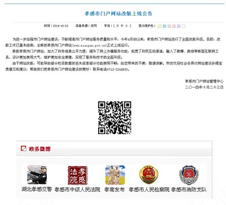 ?。?)互動多渠道。孝感市門戶網(wǎng)站每條文字、視頻新聞下方都會有微信二維碼掃描區(qū),網(wǎng)民可以通過掃描該二維碼轉(zhuǎn)發(fā)、分享新聞信息。同時,孝感市門戶網(wǎng)站開通官方微博,發(fā)布市內(nèi)重大政務(wù)、民生新聞。門戶網(wǎng)站也提供了孝感市法院、檢察院、消防、交警等多部門官方微博入口,為政民互動提供更多渠道。