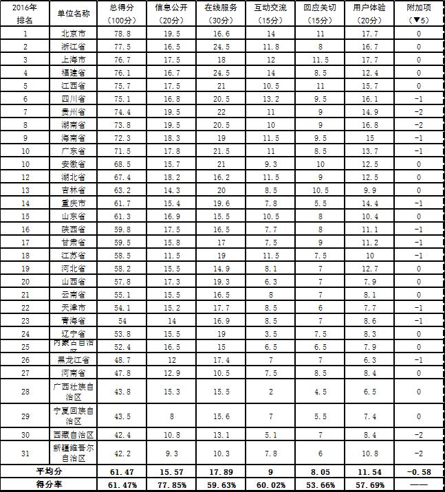 如下是2016年全國省級網(wǎng)站績效評估得分排名:
