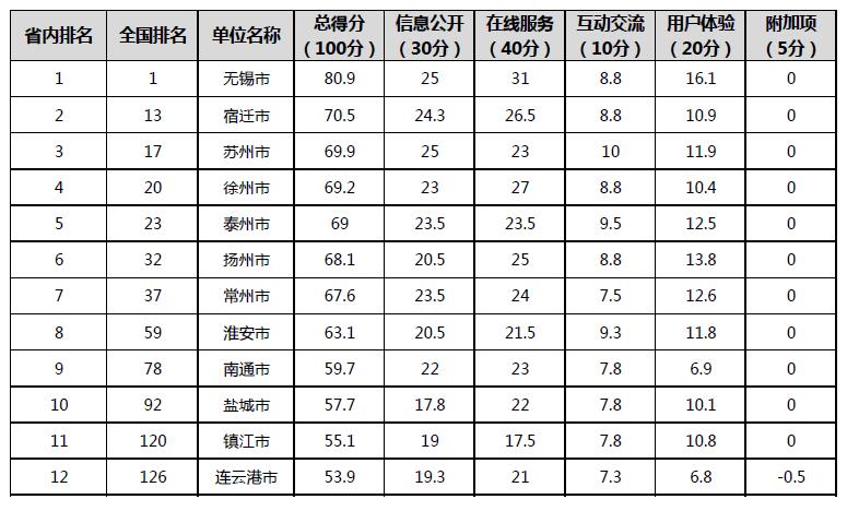 本次網(wǎng)站測評分別從信息公開、在線服務、互動交流、用戶體驗和附加項五個方面進行評分,在此次參評的299個地級市網(wǎng)站中,無錫市以80.9分第六次位列全國地級市網(wǎng)站評估第一,省內(nèi)除省會南京單獨評估以外,其它12市的排名順序依次為無錫、宿遷、蘇州、徐州、泰州、揚州、常州、淮安、南通、鹽城、鎮(zhèn)江、連云港,其中江蘇省10個市在全國百強名單。
