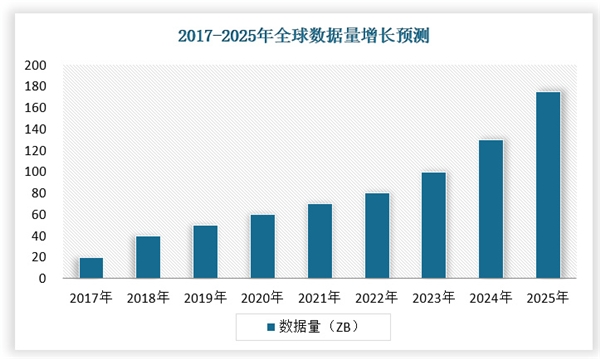 據(jù)互聯(lián)網(wǎng)數(shù)據(jù)中心(IDC)預(yù)測,全球數(shù)據(jù)量將從2018年的33ZB增至2025年的175ZB,增長超5倍;中國平均增速快于全球3%,預(yù)計到2025年將增至48.6ZB,占全球數(shù)據(jù)量的比例由23.4%提升至27.8%。