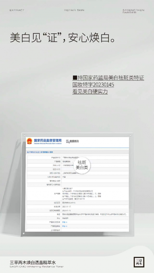 萬物復(fù)蘇的春季,正是肌膚美白的好時節(jié),是時候研究皮膚美白,為夏日做準(zhǔn)備了。而我們在選擇美白產(chǎn)品的時候,不止是讓肌膚實現(xiàn)自然透亮的白,還要注重美白的安全性。三草兩木煥白透晶精萃水(以下簡稱:三草兩木白晶水)不但能夠?qū)崿F(xiàn)皮膚的美白煥亮,還拿下了美白特證,雙重保障只為滿足愛美人士的安全美白需求。