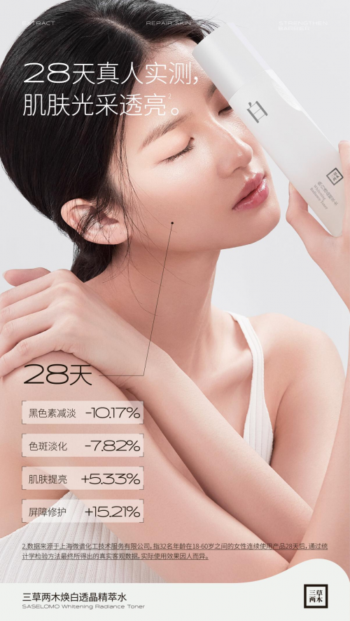經(jīng)過國家藥品監(jiān)督管理局的嚴(yán)格檢測認證,才能拿到“國妝祛斑美白類特證”,官方特證為白晶水上了一層“安全鎖”,也彰顯了白晶水的美白硬核實力。除此之外,三草兩木白晶水在正式上市之前,還經(jīng)過了專業(yè)機構(gòu)進行的“28天真人實測”,32名年齡在18-60歲之間的女性連續(xù)使用白晶水28天之后,檢測數(shù)據(jù)表明:黑色素減淡10.17%,色斑淡化7.82%,肌膚提亮5.33%,屏障修護提升15.21%。從這個數(shù)據(jù)不難看出,三草兩木白晶水在淡化黑色素及色斑、提亮肌膚、修護屏障等方面都有不錯的功效。