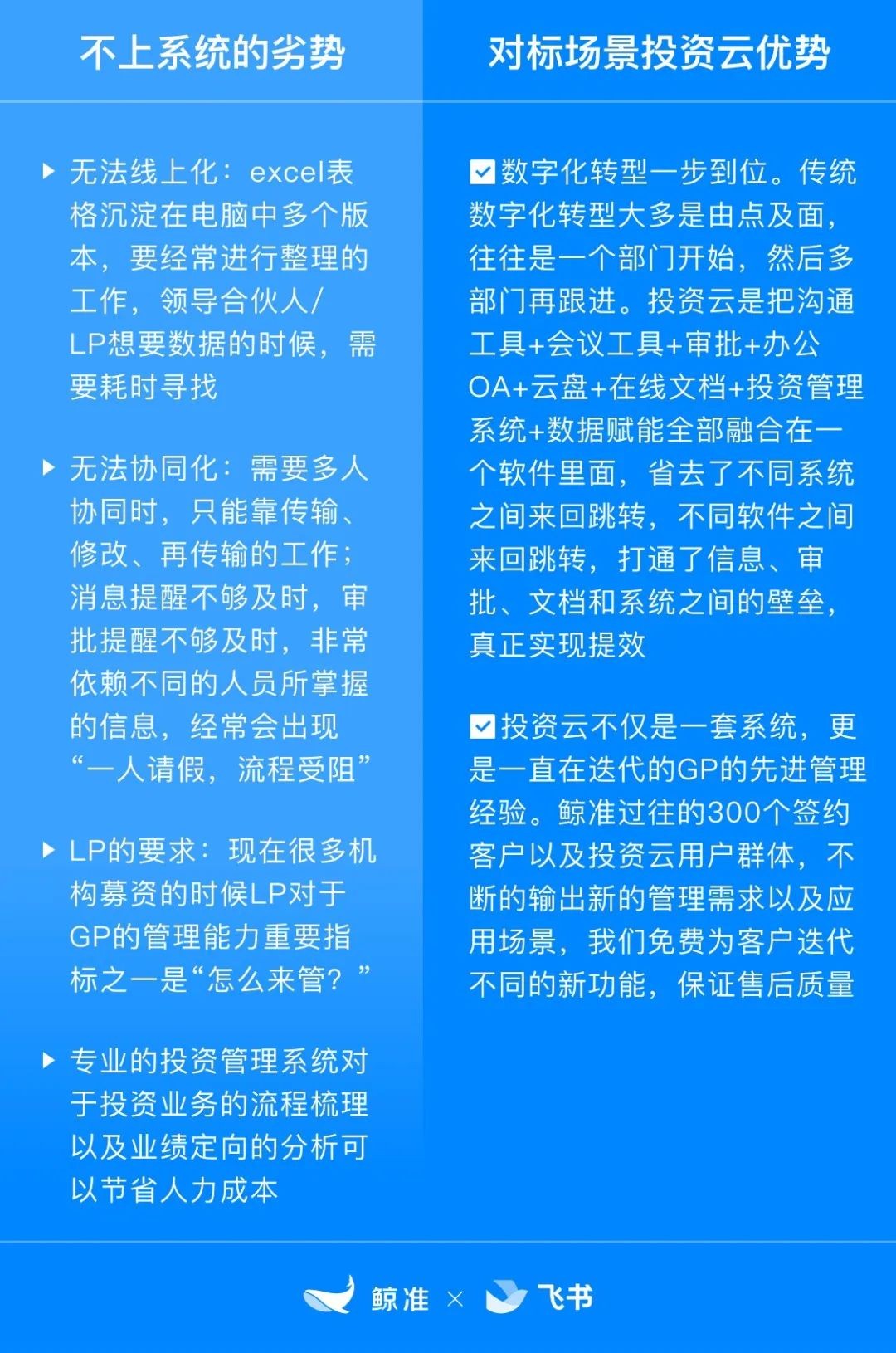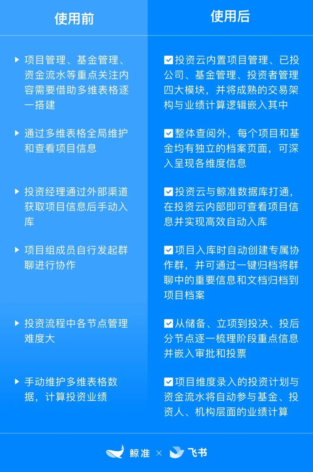 鯨準(zhǔn)和飛書聯(lián)合推出的“投 資云”極大契合了“好產(chǎn)品”的定義。