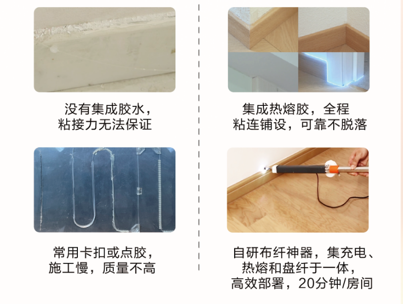 相較沒有集成膠水、粘接力無保證的普通透明光纜,其透明光纜不僅自帶“隱身術(shù)”,裝好后絲毫不會給人一種亂糟糟的感覺,由于集成了熱熔膠,它還支持全程粘連鋪設(shè),減少了后續(xù)脫落的風險。