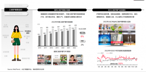 比如頭發(fā)護(hù)理中,頭皮和頭發(fā)的護(hù)理分開,頭皮精華/干發(fā)噴霧增長迅速,頭皮修護(hù)/抗老進(jìn)階需求增速迅猛??谇蛔o(hù)理中,沖牙器、美白貼等新品類增速很快,根據(jù)《趨勢報告》數(shù)據(jù),*2022年站內(nèi)美白牙貼相關(guān)搜索同比增長189%,用戶也會更關(guān)注這些工具使用方法。
