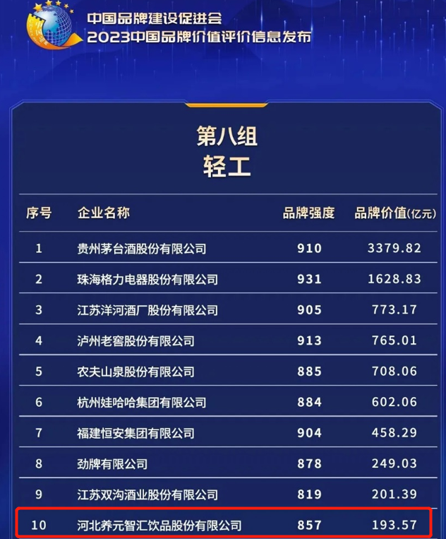 一、2023中國(guó)品牌價(jià)值評(píng)價(jià)信息發(fā)布,養(yǎng)元飲品位居輕工行業(yè)第十