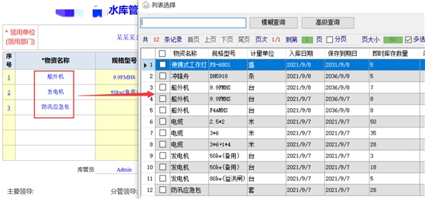 在列表選擇養(yǎng)護物資時,系統(tǒng)會自動過濾出需要養(yǎng)護并且當(dāng)前有庫存的物資。