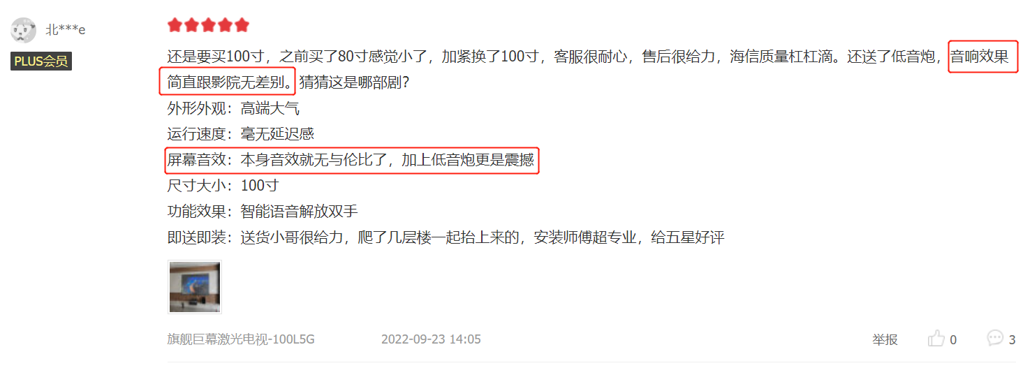 同時(shí),該產(chǎn)品機(jī)體以科技感外殼搭配混織網(wǎng)罩,典雅大氣,與高格調(diào)現(xiàn)代客廳完美融為一體。用戶對(duì)100L5G的高顏值贊不絕口,“美觀好看”“大氣”“高級(jí)”成為高頻詞匯。