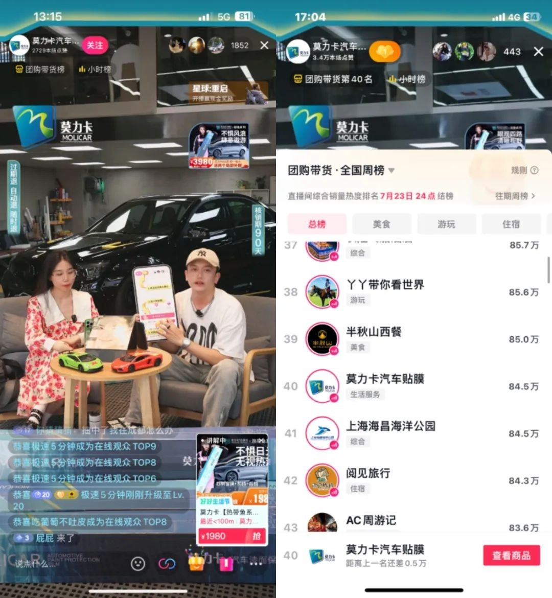 在保持直播間人氣的同時,莫力卡汽車貼膜還采取精細化運營,實時關(guān)注流速的控制,提高流量的穩(wěn)定性,實現(xiàn)最高場觀近1900人,并實時進入全國帶貨榜第40名的好成績。在不斷測試調(diào)節(jié)的過程中,莫力卡汽車貼膜及時做好對應(yīng)人群的定位校準,讓直播間前端與交易端形成強有力配合,持續(xù)增加單場GMV的爬坡,實現(xiàn)了賬號近500位新增粉絲量,為后續(xù)銷售與營銷強力蓄水。