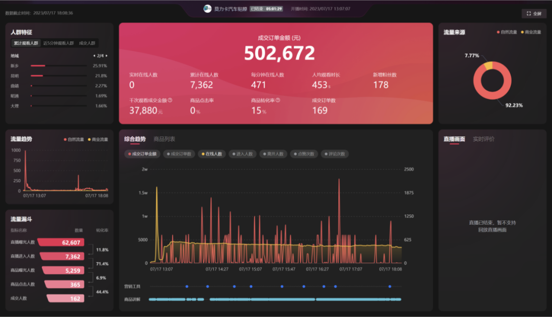 在整個直播過程中,恒樂影視使用了「巨量本地推」新功能“全域推廣”,在此作用下,莫力卡汽車貼膜直播間成交量成倍增長。另外,通過對直播節(jié)奏的把控,進行卡點投放,莫力卡汽車貼膜以觀看及成交TOP城市/地域為導(dǎo)向,對核心年齡段進行群體拓展,實現(xiàn)了低成本擴流和品宣。