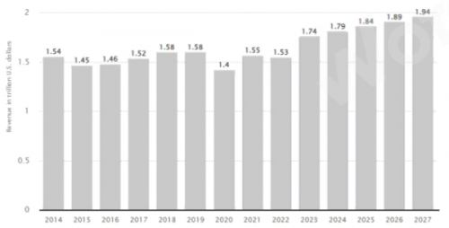 2014年至2027年全球服裝市場(chǎng)收入現(xiàn)狀及趨勢(shì)