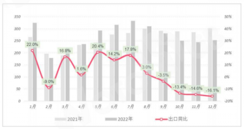 2021-2022年中國(guó)紡織品服裝月度出口額及同比增速