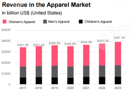 據(jù)statista調(diào)查數(shù)據(jù)顯示,全球服裝市場(chǎng)的收入預(yù)計(jì)將在2023年至2027年間持續(xù)增長(zhǎng)2000億美元,增速高達(dá)11.49%。預(yù)計(jì)到2027年,收入達(dá)到1.94萬(wàn)億美元,總體呈現(xiàn)良好的發(fā)展勢(shì)頭。僅美國(guó)服裝市場(chǎng)收入就高達(dá)3120億美元,位居世界第 一。