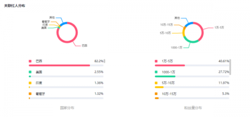 從WotoHub反饋的Veja關(guān)聯(lián)紅人分布情況來(lái)看,該品牌的主要目標(biāo)市場(chǎng)為巴西,紅人占比82.2%。在整個(gè)營(yíng)銷(xiāo)推廣策略中Veja集中選擇中長(zhǎng)尾部紅人,合作粉絲量在1到15萬(wàn)區(qū)間內(nèi)的紅人數(shù)量占比85.6%。