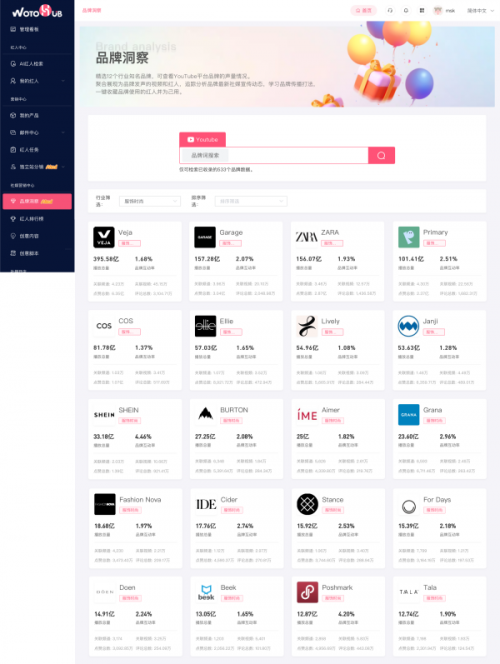為了幫助品牌更好地解決這個(gè)問(wèn)題,WotoHub海外紅人智能營(yíng)銷(xiāo)云基于自身的品牌洞察功能,收集了不同行業(yè)的品牌紅人營(yíng)銷(xiāo)動(dòng)態(tài),讓品牌能夠快速洞察到行業(yè)動(dòng)向,學(xué)習(xí)競(jìng)品運(yùn)營(yíng)邏輯。同時(shí)能對(duì)競(jìng)品合作的高互動(dòng)、高播放量的營(yíng)銷(xiāo)內(nèi)容進(jìn)行定向開(kāi)發(fā),挖掘出更多適配的紅人資源。