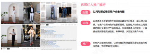 比如紅人好物測(cè)評(píng),單品/合集強(qiáng)勢(shì)種草的玩法,通過(guò)標(biāo)明品牌詞、品類(lèi)詞或服裝產(chǎn)品賣(mài)點(diǎn),視頻內(nèi)容上進(jìn)行服裝產(chǎn)品的全方位測(cè)評(píng),精準(zhǔn)滿(mǎn)足消費(fèi)者訴求,影響消費(fèi)者決策。